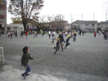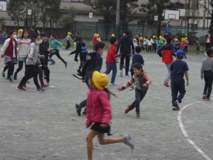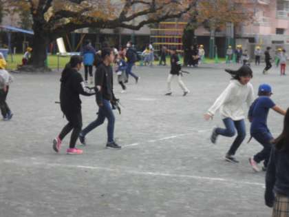 休み時間に、上級生のお兄さん、お姉さんと一緒にしっぽとりのゲームが始まりましたよ〜