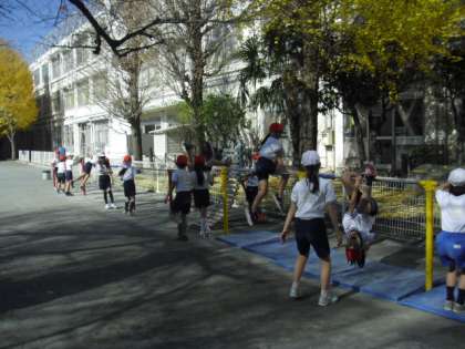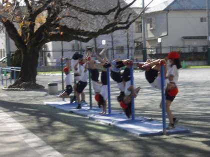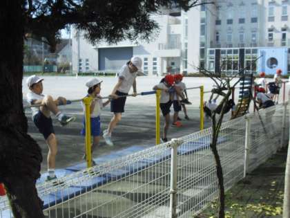 中学年の鉄棒運動では、基本的な上がり技、支持回転技、下り技ができるようにします。