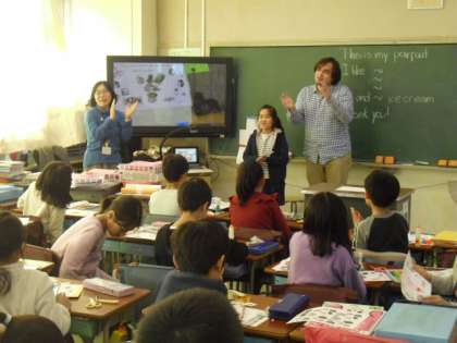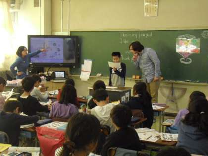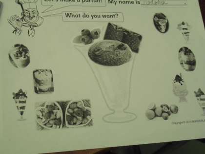 好きなフルーツをもりつけて、できたパフェを大型画面を使ってみんなに紹介〜