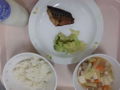 ごはん・牛乳・鯖のピリ辛焼き・きゅうりとキャベツの浅漬け・豚汁