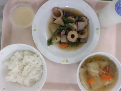 ごはん(青森県産つがるロマン)・牛乳・イカと大根の煮物・せんべい汁