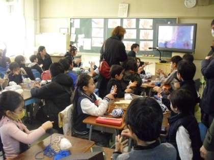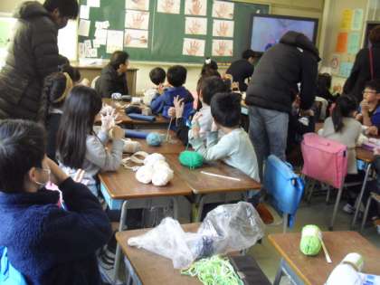 図工作品のマフラー作りに向け、指編みに挑戦〜