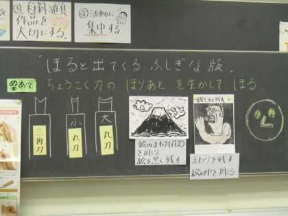 彫刻刀の違いでのほり後を生かして、自分が表現したい版画づくりに取り組んでいました。