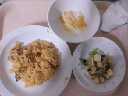 ジャンバラヤ・牛乳・フライドポテトビーンズサラダ