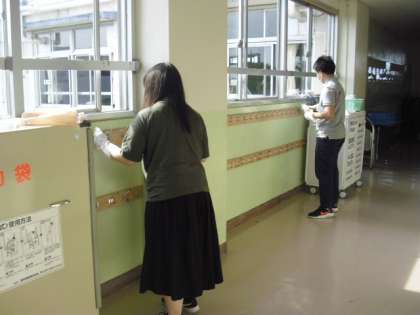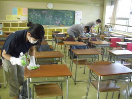 子どもたちが使った机などの消毒作業をしています。