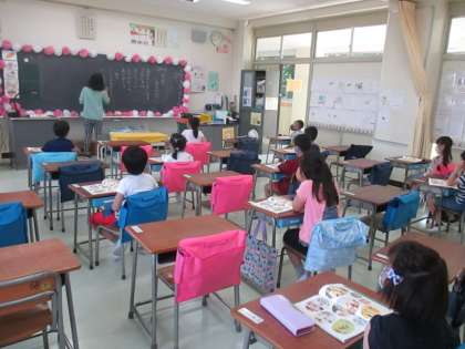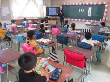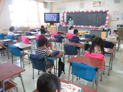 【国語】 学校生活で使うたくさんの言葉を、教科書の絵を見ながら考えました。友達を大切にする言葉も聞こえてきました。