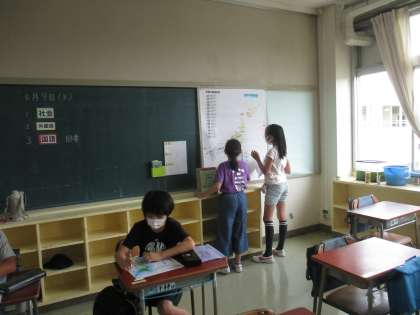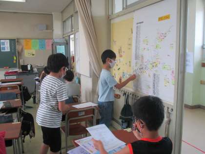 家庭学習で調べてきた食べ物の産地を、白地図にまとめました。みんなが調べた産地を集めると、地域の特徴が見えてきました。