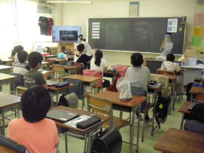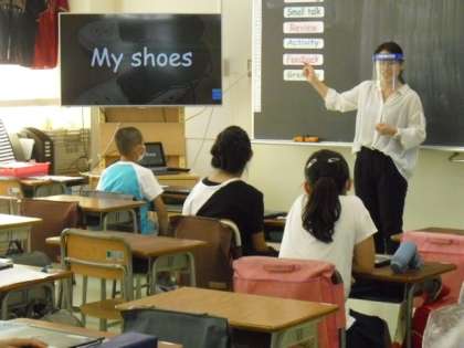 英語専科の先生と、学習支援員の先生と一緒に英語の学習です。