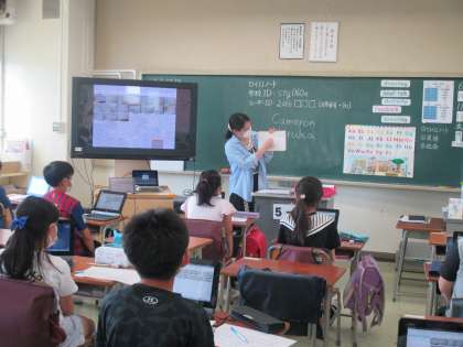 ICT機器を活用しての学習です。ロイロノートの使い方を学び、友達が作ったカードを共有しています。英語の授業では、自分の好きなものをいくつか挙げ、紹介しました。