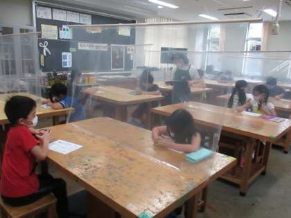 図工室での授業が始まりました。パーテーションで仕切り、学習をしています。