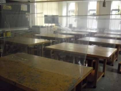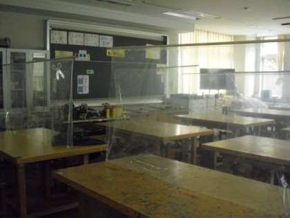 図工室も、学習活動の実現に向けて机の間に仕切りを付けました。