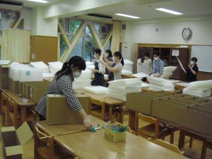 各校に配布されたパーテーションを組み立て、各クラスごとに分ける作業をしました。