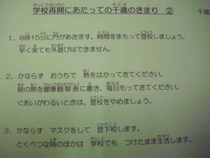 早く来ても、校内には入れないので、分散登校中に早く到着してしまった人は、家を出る時刻を調整して、時間を守って登校してくださいね。