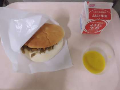 きんぴらバーガー・牛乳・かぼちゃプリン