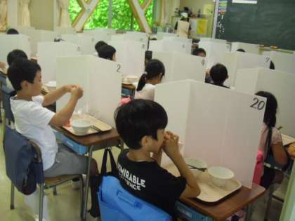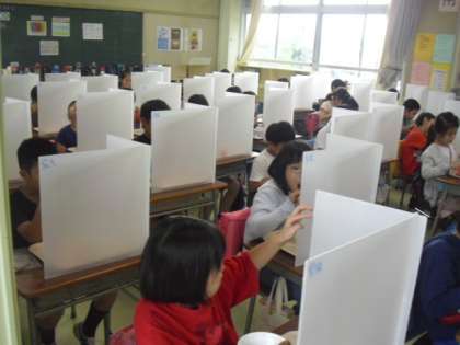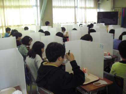 マスクを外す給食の時間は、飛沫感染防止のためパーティションを立て、食べています。