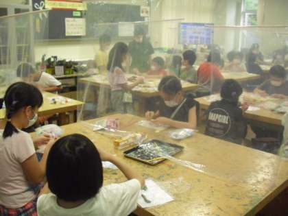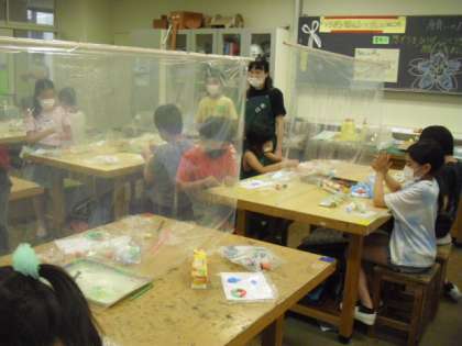 飛沫感染防止のシートを貼った図工室で、想像を広げ作品作りに励んでいました〜