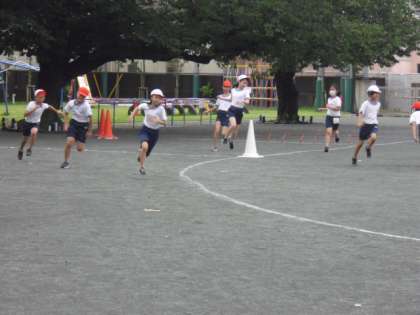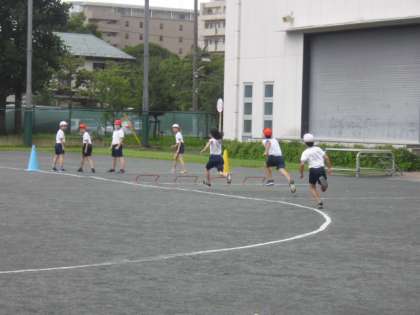 接触感染を避けるため、バトンを使わずに、ミニハードルを跳び越えたら次の走者がスタートします。