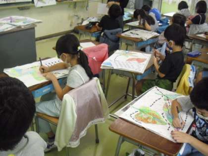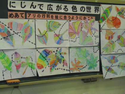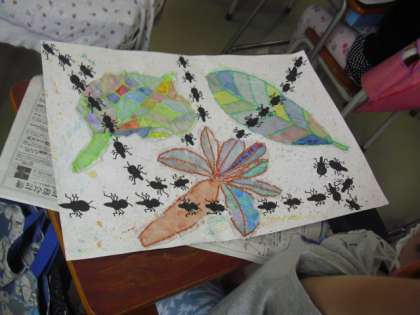 画用紙に自分らしい葉を配置した後、ありの行列を描きました。