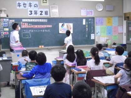 自分色に染めた葉っぱを画用紙の上に配置し、ありの行列を書き加える場面でした。