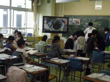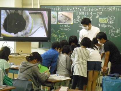 雨が降っていた校庭で水が流れていたり、たまったりしている様子を観察して、雨水の流れや水のしみこみ方について予想を立てて考える学習が進んでいました。