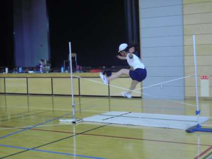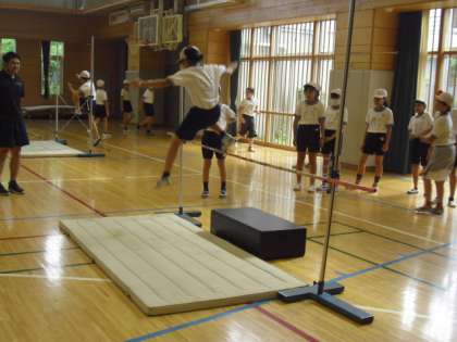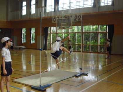 リズミカルな助走から踏み切って跳ぶことができるように、助走、空中動作、踏切、着地など自己の練習課題にあわせた学習の場を選んでの練習が進んでいました。