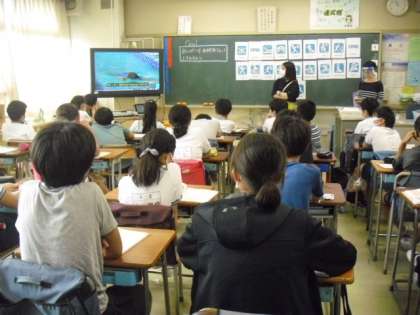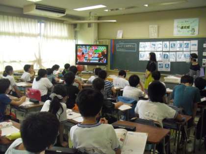 英語専科の先生と学習支援の先生と一緒に外国語の学習です。