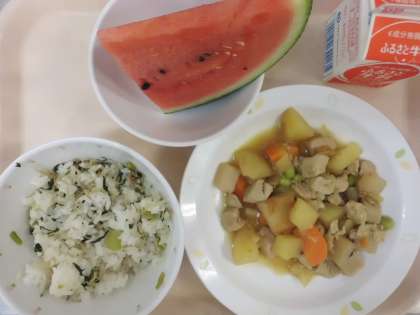青菜とじゃこのごはん・牛乳・いりどり煮・くだもの(スイカ)