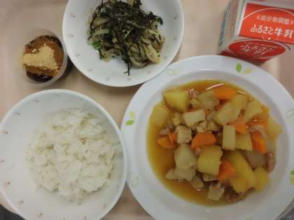 麦ごはん・牛乳・肉じゃがうま煮・こまつなの海苔和え・黒蜜寒天