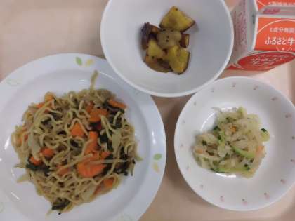 塩焼きそば・牛乳・じゃこのカリカリサラダ・りんご大学芋