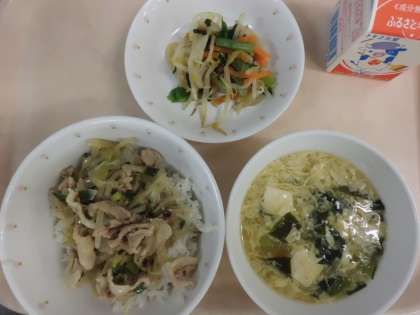 ねぎ塩豚丼・牛乳・野菜の菊花あえ・かき玉汁