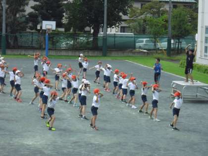 5年生のソーラン節の練習です。学年全体で集合ぜず、校庭では2クラスごとに練習しています。