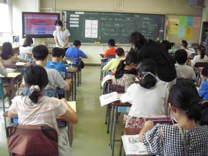 英語専科の先生と英語支援員さんと一緒に外国語の学習です。