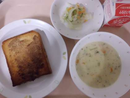 セサミトースト・牛乳・クラムチャウダー・コールスローサラダ