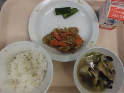 麦ごはん・牛乳・豚肉のごま生姜いため・きゅうりのひとしお