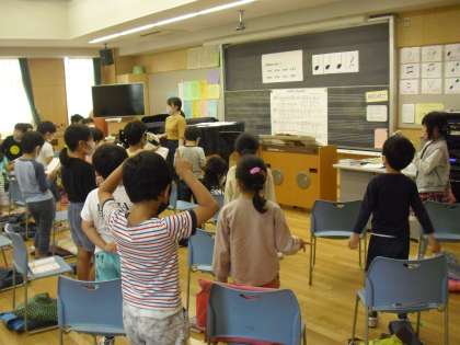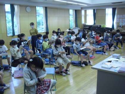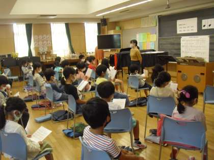 感染予防に向け、声を出して歌う活動を控えていますが、音楽室では範唱となるCDの歌声をかけながら、マスクをしたまま、大きな声を出さない歌唱指導を少しずつ開始しています。