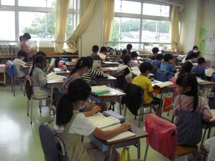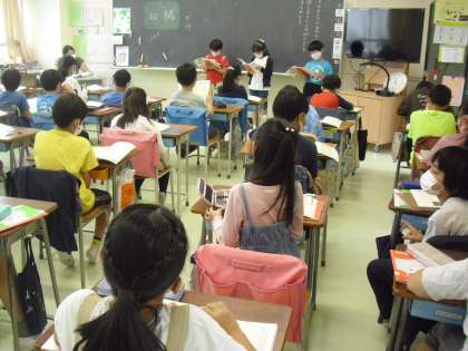 教材文を使って、話合いの仕方、意見の言い方について学習している4年生・・・
