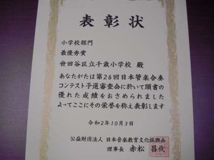 コロナ禍でさまざまなコンクールも活動自粛となりましたが、演奏を動画で撮り応募したコンクール、「第26回日本管楽合奏コンテスト」予選審査会で千歳小学校吹奏楽団が、小学校部門で最優秀賞に選ばれ、全国大会に進みます。