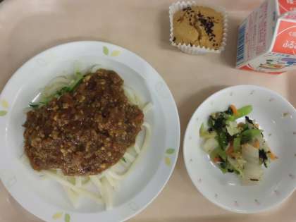 盛岡じゃじゃ麺・牛乳・野菜の香味あえ・黒糖蒸しパン