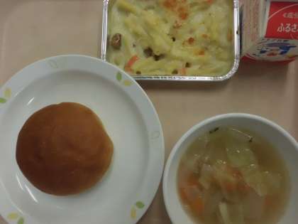 丸パン・牛乳・マカロニグラタン・野菜スープ