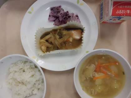 麦ごはん・牛乳・鮭のチャンチャン焼き・大根のゆかりかけ