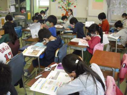 調べたことを表現する(発信する)方法として、新聞やパンフレットなどがあることを学習した4年生・・・