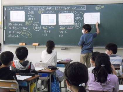 いくつかに分けたり、欠けている部分を補って長方形にしたりと、考えながら、解決し、友達と考えを交流していました。