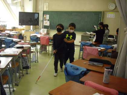 目が見えなかったら、道を歩くときどんな感じなのか、誘導してもらいながら杖をつき、歩いてみました。