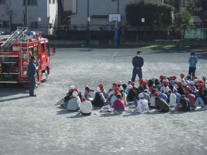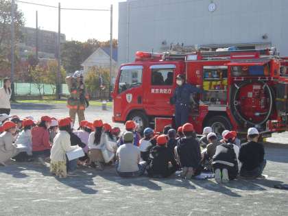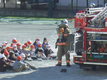 火事の時に活動する作業服、そしてポンプ車など実際のものを直接見せていただきながら、消防署の方々のお話から学びました。