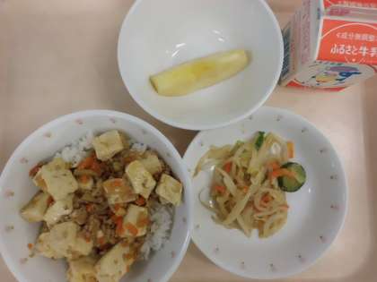 麻婆豆腐丼・牛乳・中華サラダ・くだもの(りんご)