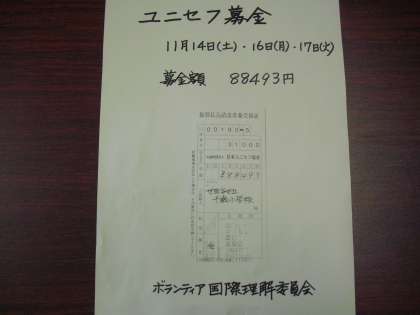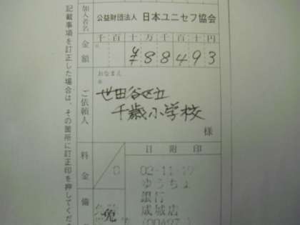 3日間で集まった募金を日本ユニセフ協会へ送りました。