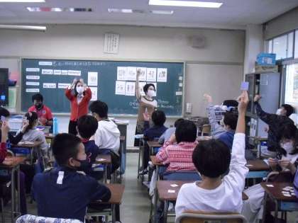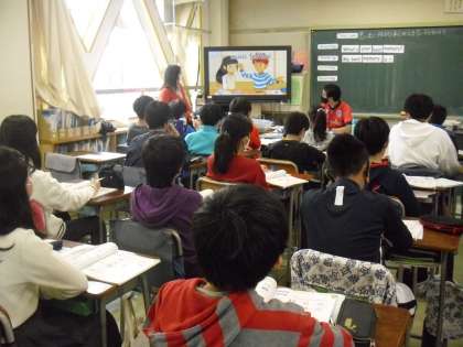 英語の先生と英語学習支援員の先生と一緒に外国語の学習です。