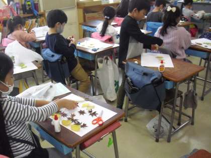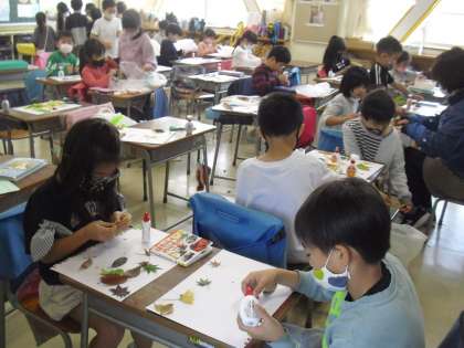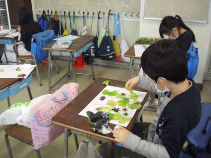 拾ってきた落ち葉やどんぐりを使って、造形活動が始まりましたよ〜