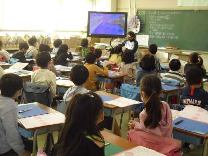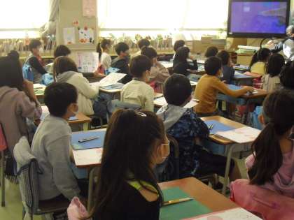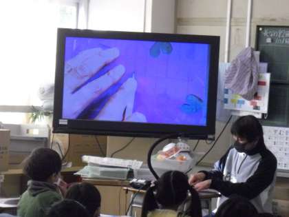 図工でカッターナイフを使って切り抜く作業に向け、カッターナイフの使い方について安全に気を付けるための指導を行っていました。