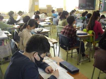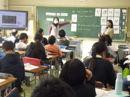 英語の先生と英語支援員の先生と一緒に、外国語の学習です。